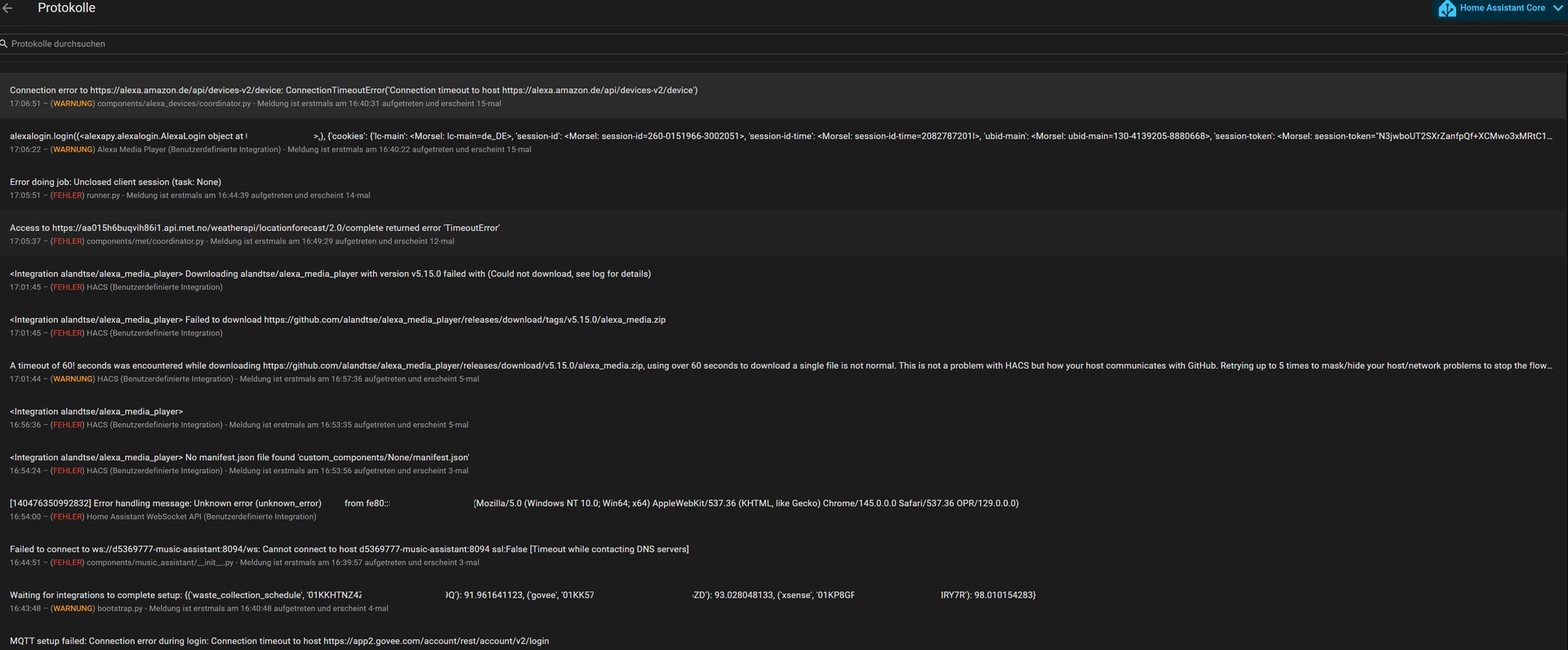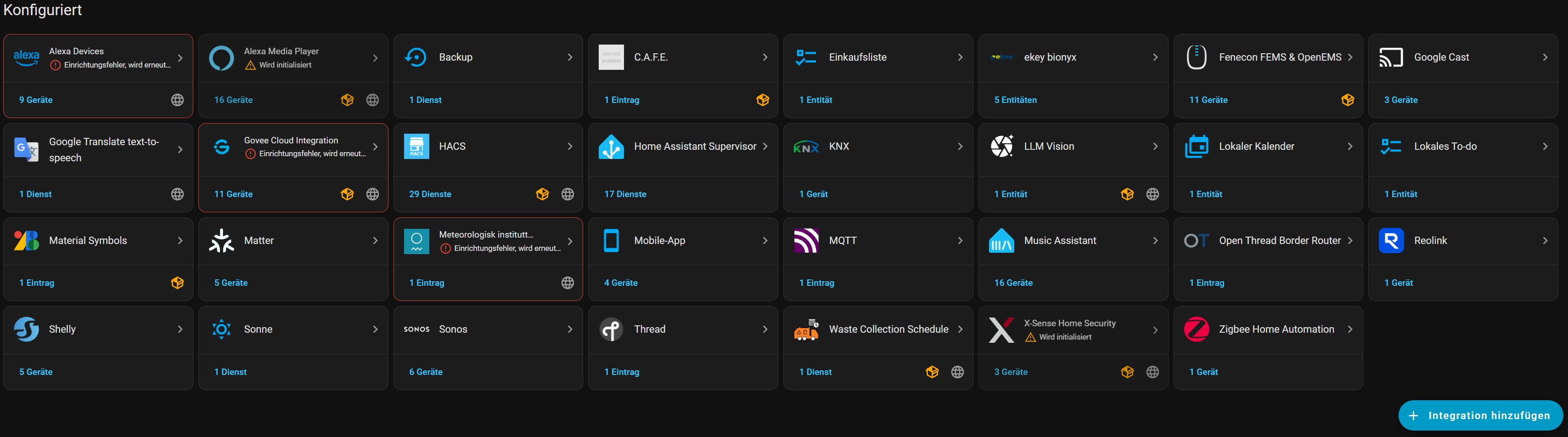 Das da einige Integrationen die eine Cloud und somit I-Net-Verbindung brauchen, wie z.B. Meteorologisk institutt (Met.no), einen Einrichtungsfehler anzeigen und andere Integrationen wie z.B. HACS dann nicht, ist schon etwas komisch.