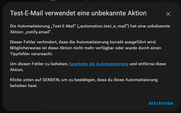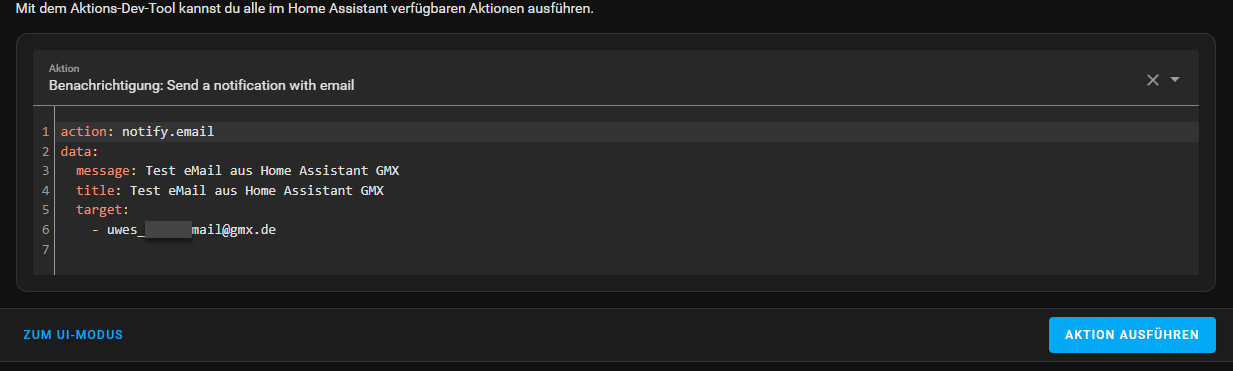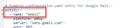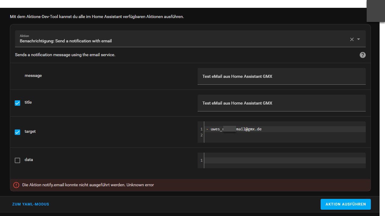 Ich habe daraufhin die Daten notijy.email für GMX komplett in der configuration.yaml gelöscht und 100% dann das gleiche nochmal händisch eingegeben. Jetzt kommet “notify.email”