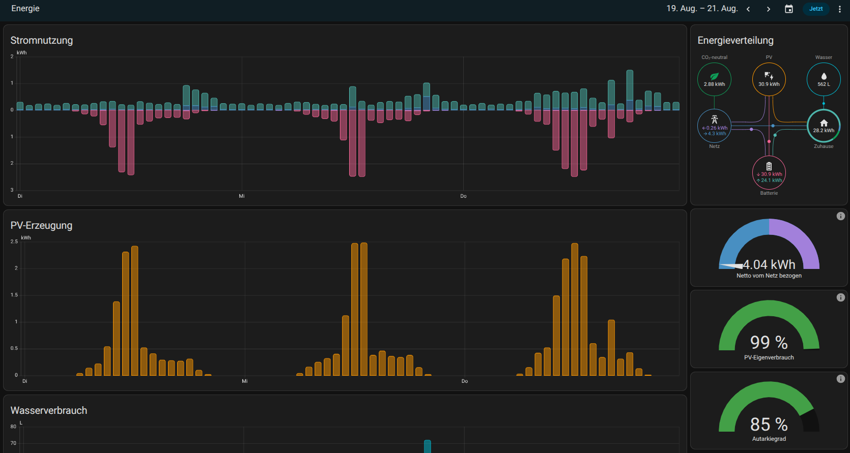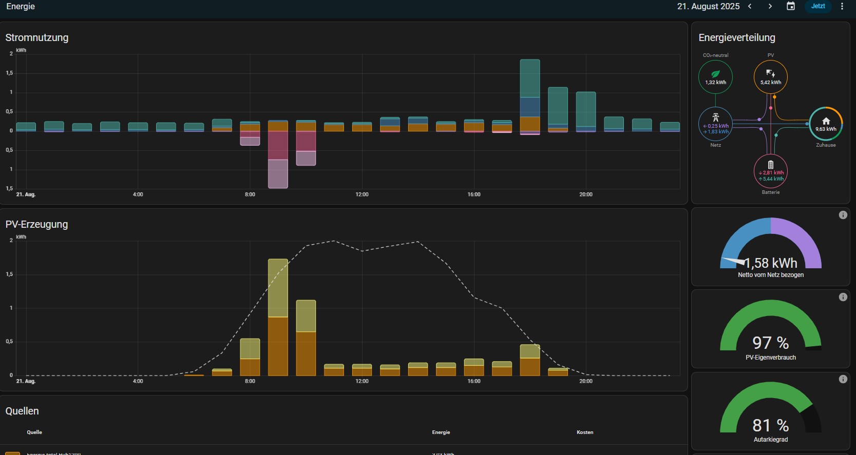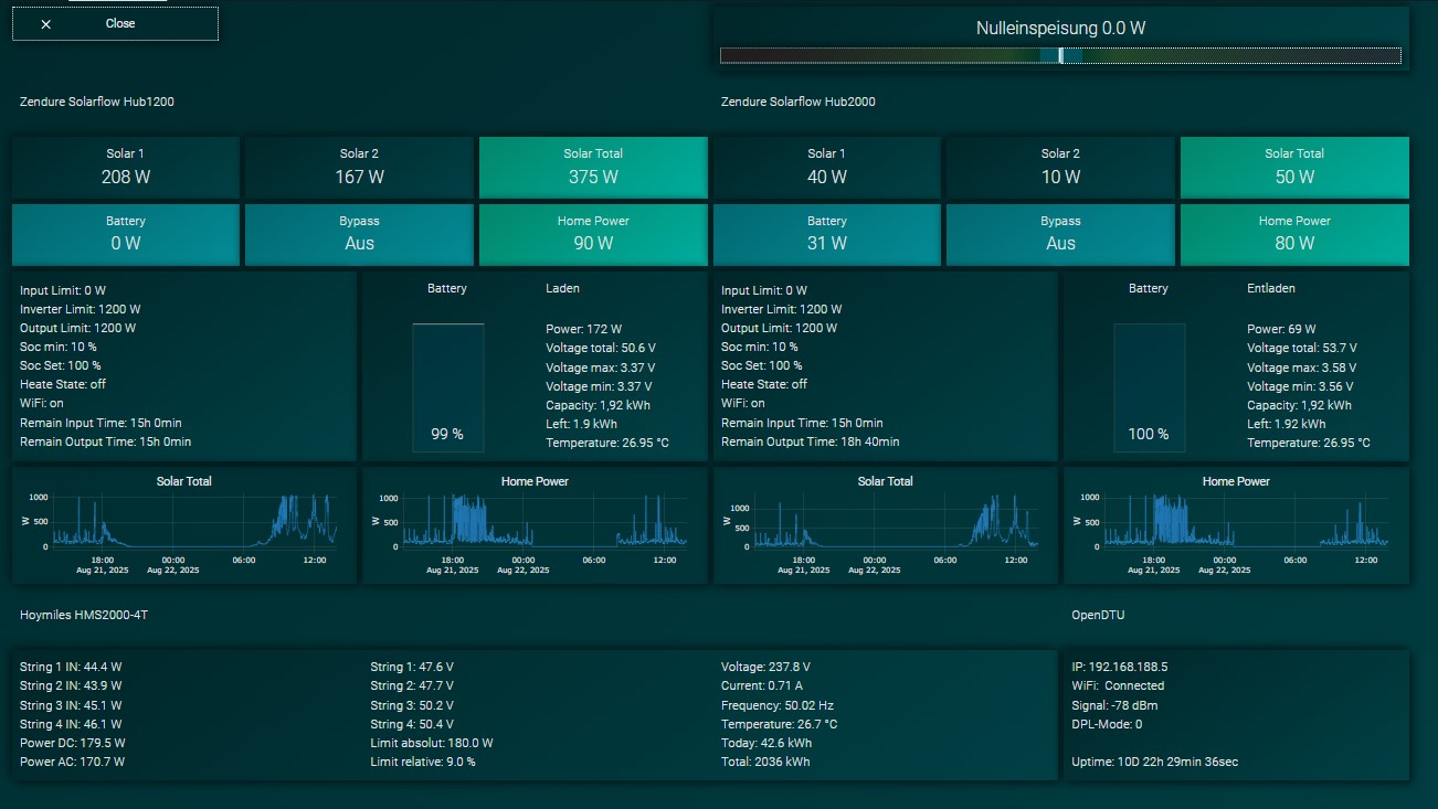 Bei mir werkelt seit fast 2 Jahren Zendur Solarflow, genauer gesagt 1x Hub1200 und 1x Hub2000. Beide Hubs mit je 1x Akku AB2000. Beide sind aus der Cloud befreit und mittels mqtt in HA eingebunden. Die Steuerung der PV-Anlage erfolgt über einen Shelly3em und openDTUonBattery. Der gesteuerte Wechselrichter ist ein Hoymiles HMS2000-4T.