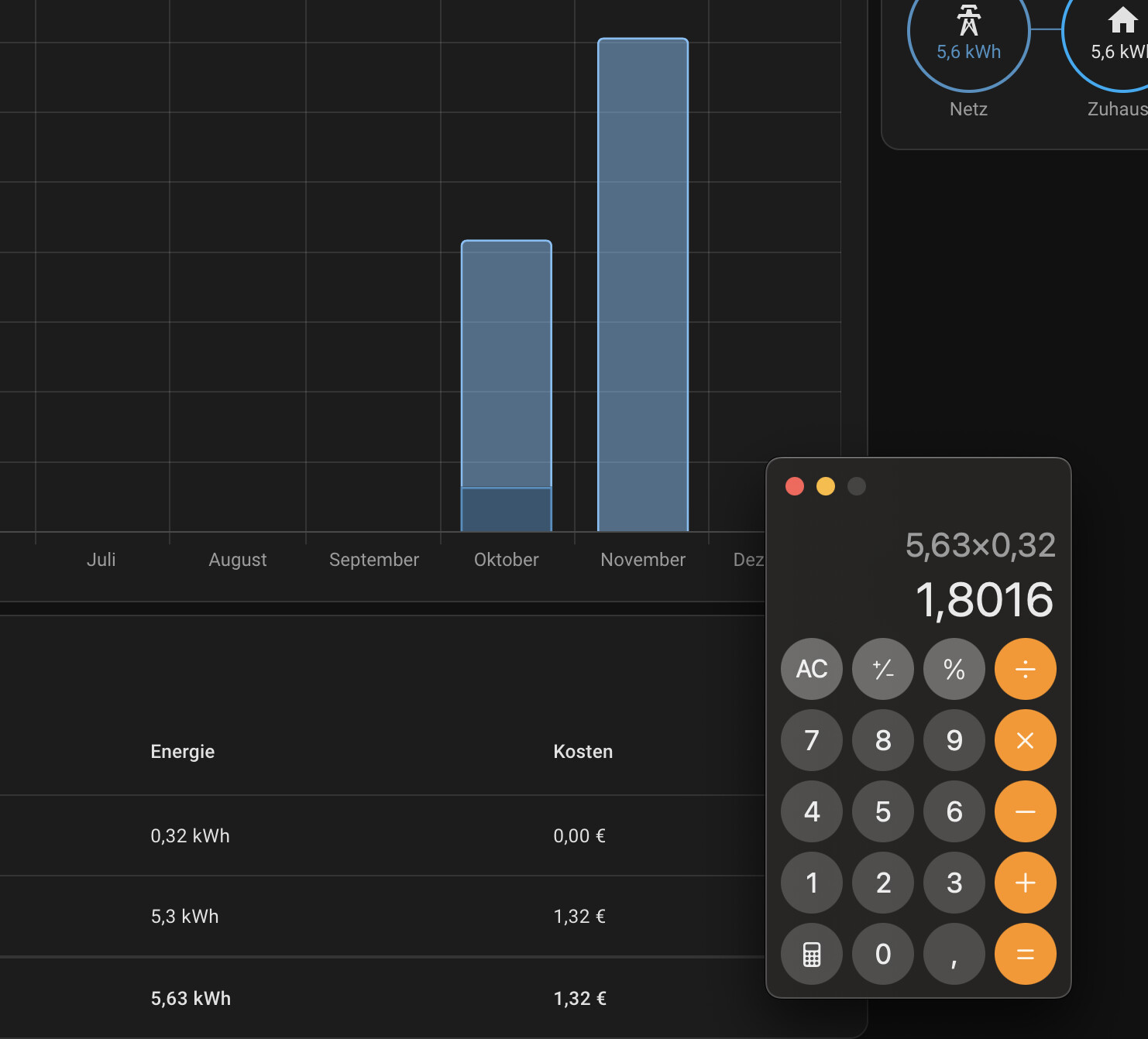 In deinem Screenshot hat auch nur der untere Eintrag überhaupt einen Wert, daher müsstest du wenn mit 5,3kWh rechnen und nicht mit der Summe. Aber auch hier stimmt das Ergebnis nicht.