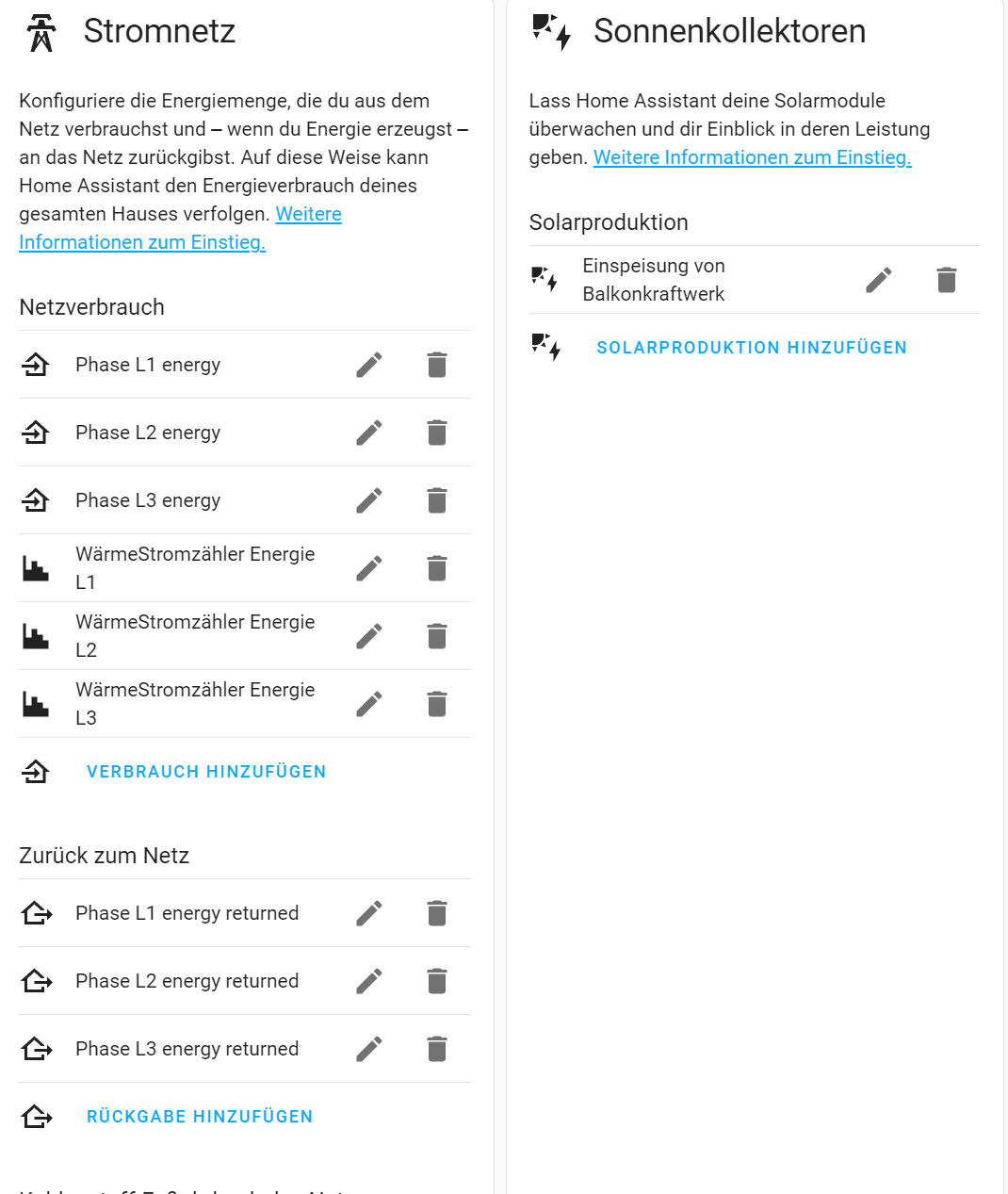 Beide Shellys (2x 3 Phasen) habe ich im Energie Dashboard als 'Nutzverbraucher" angelegt und unter "Zurück zum Netz" die 3 Phasen des Haus-Stromzählers.