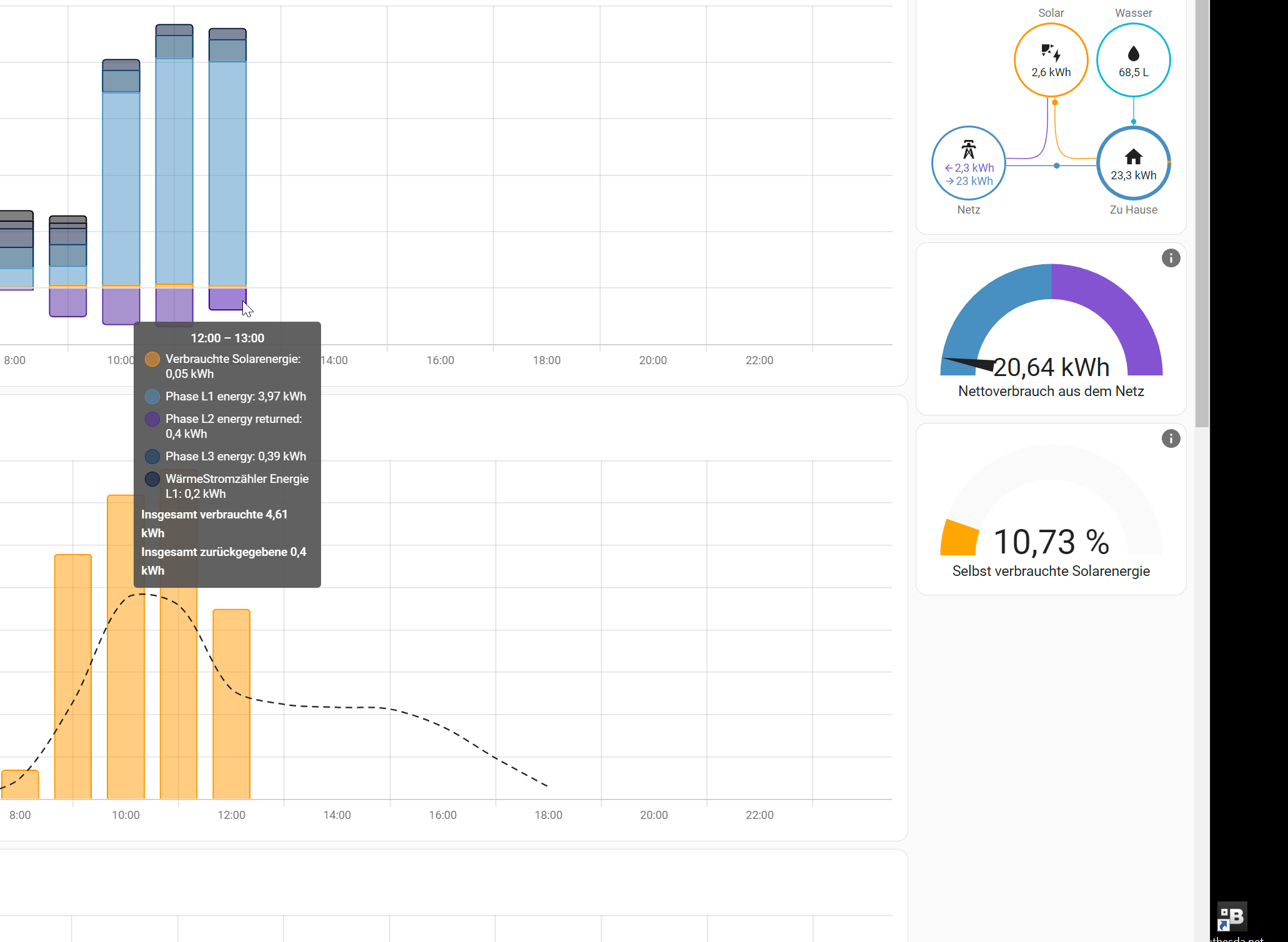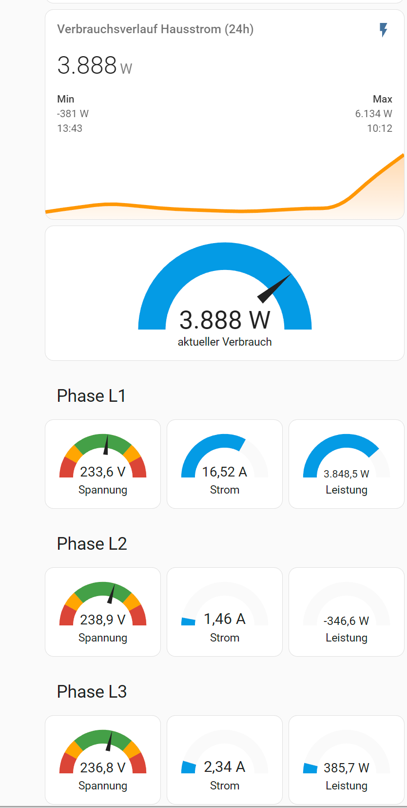 Wenn ich mir aber den Verbrauch der 3 Phasen des Hausstroms anschaue, wird dieser jedoch richtig berechnet! "aktueller Verbrauch" = Leistung L1 + Leistung L2 + Leistung L3 (Leistung L2 ist negative, da das Balkonkraftwerk einspeist)