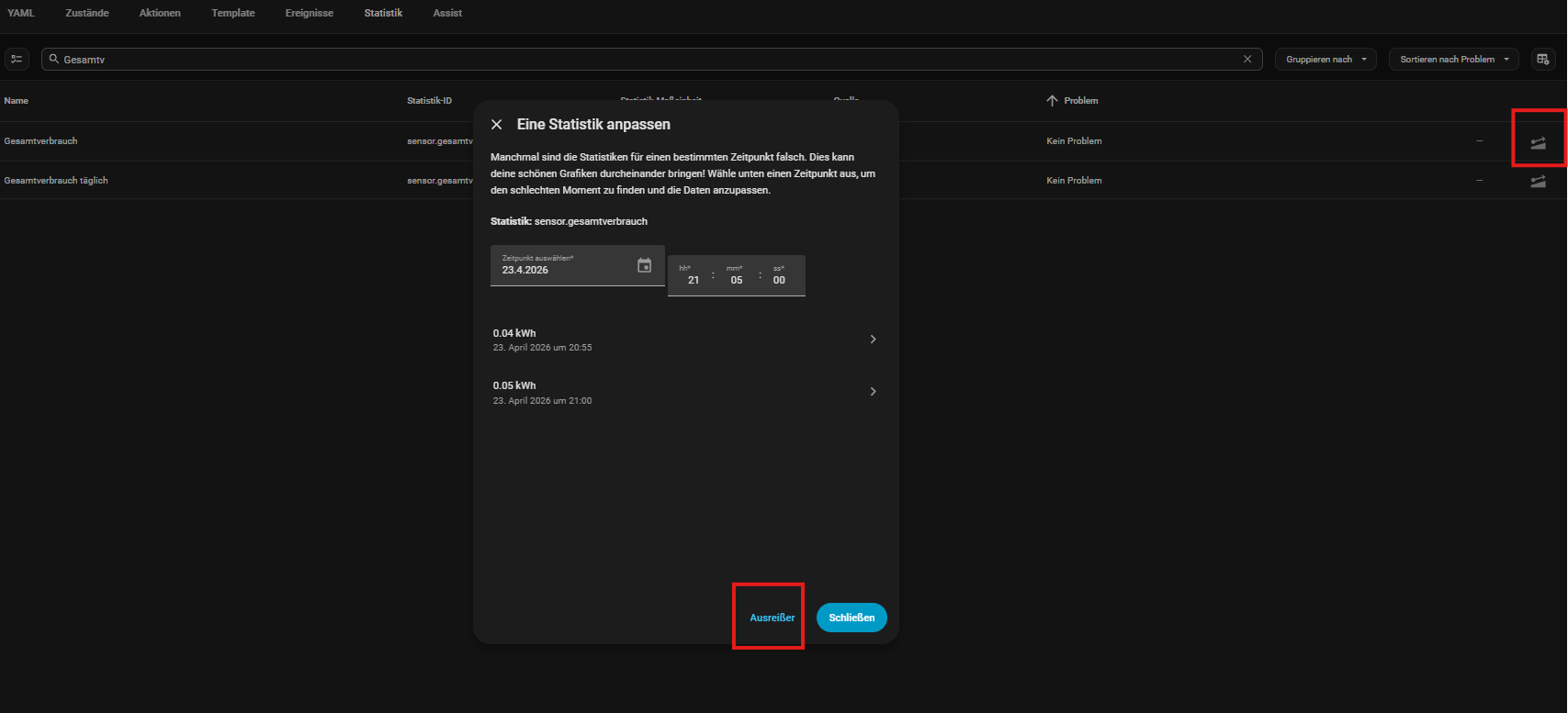 Dann in der Zeile ganz rechts auf das Diagramm-Symbol klicken. In dem sich nun öffnenden PopUp mal “Ausreißer” anklicken. Dort wirst du bestimmt sehen wann ein nicht plausibler Netzbezug erfolgte. Diesen kannst du dann dort korrigieren und durch einen korrekten Wert ersetzen. Den korrekten Wert musst du dir ausrechnen anhand der Differenz.