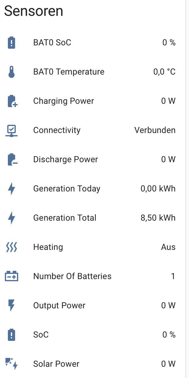 Für die die PV-Anzeige habe ich jetzt den Wert “Generation Total” angenommen, da der ja, wie von HA, gewünscht, in kWh zählt.