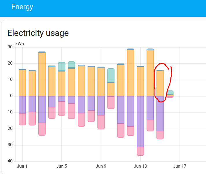 Ich habe ein ähnliches Problem mit der Anzeige der Balken. Es wird in der Monatsansicht für den 15.6. kein Verbrauch der Batterie angezeigt obwohl es in der Tagesansicht zu sehen ist. Die Gesamtwerte stimmen aber.