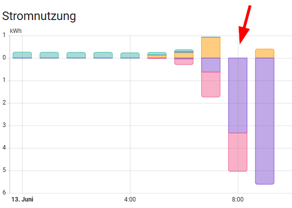 Beispielsweise sieht man in einem Screenshot von heute, dass zwischen 8 und 9 Uhr kein Verbrauch angezeigt wird, obwohl zu allen anderen Stunden Werte vorhanden sind.
