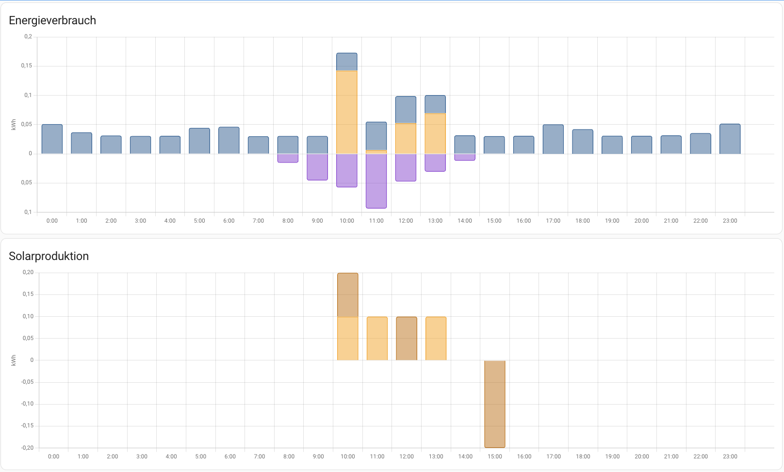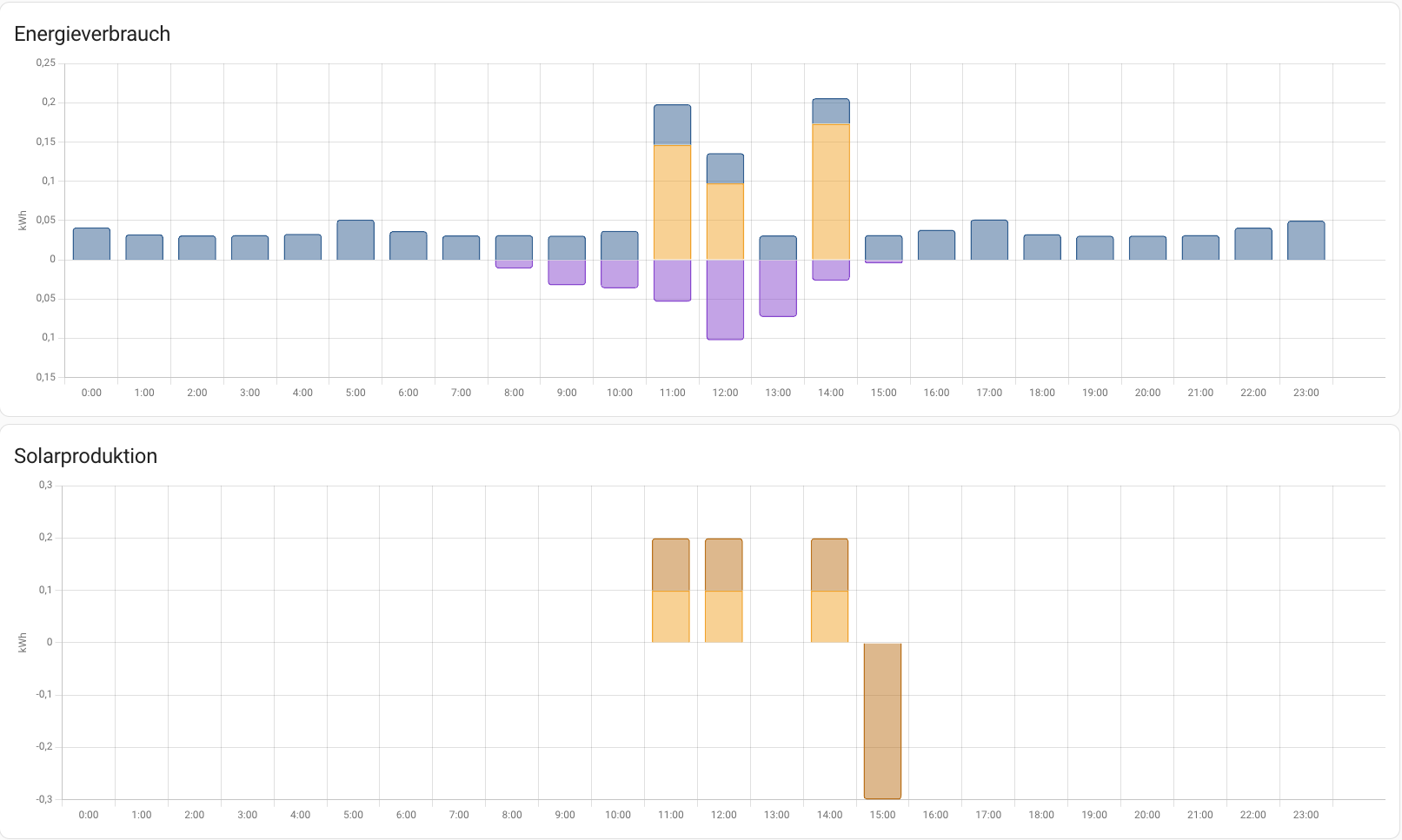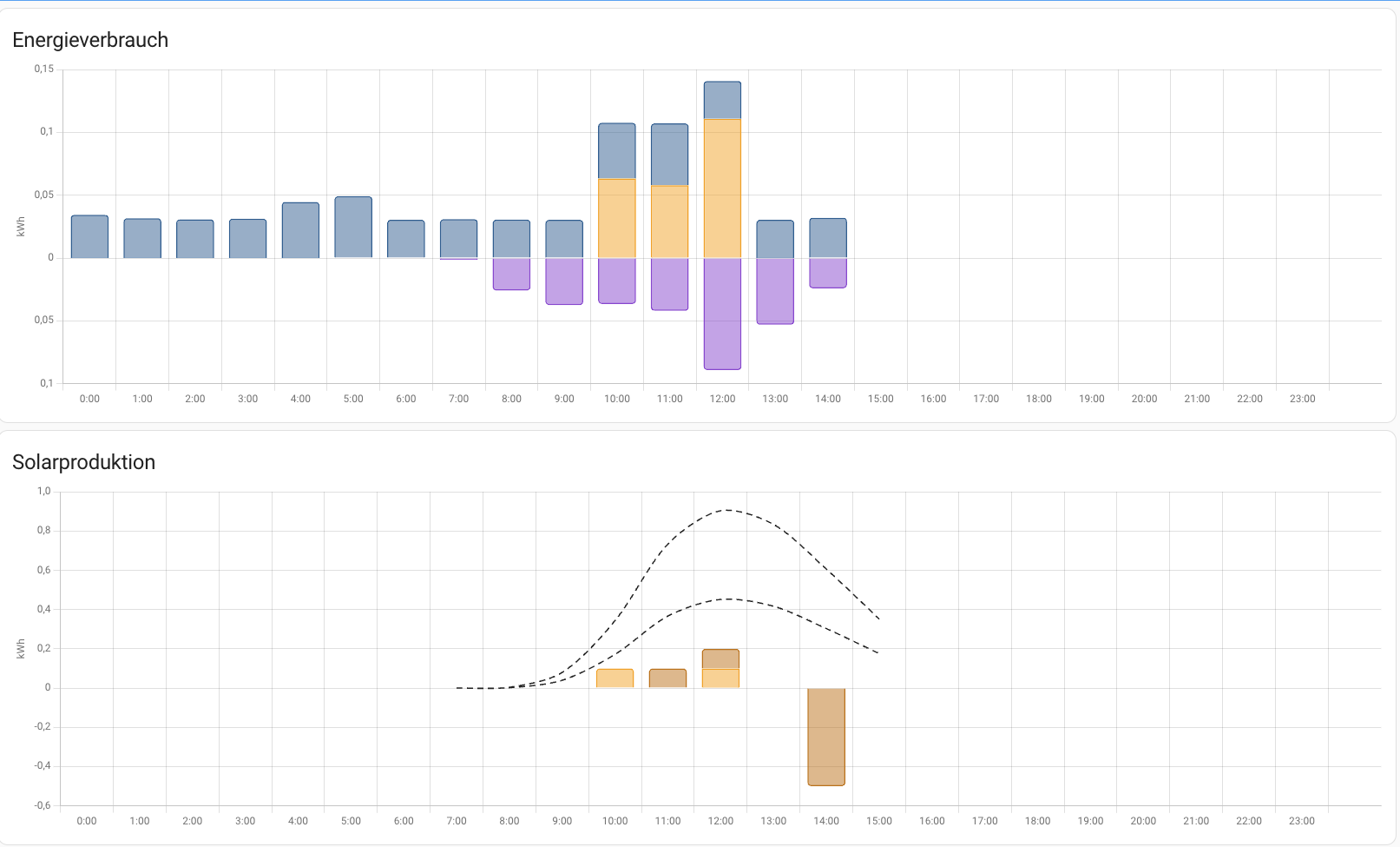 Im Verlauf ist ( Bild 1 ) ist klar zu erkennen dass alleine heute bei klarem Wetter die Ausbeute gut war aber in der Verbrauchsübersicht 13-14 Uhr kompletter Ausfall.