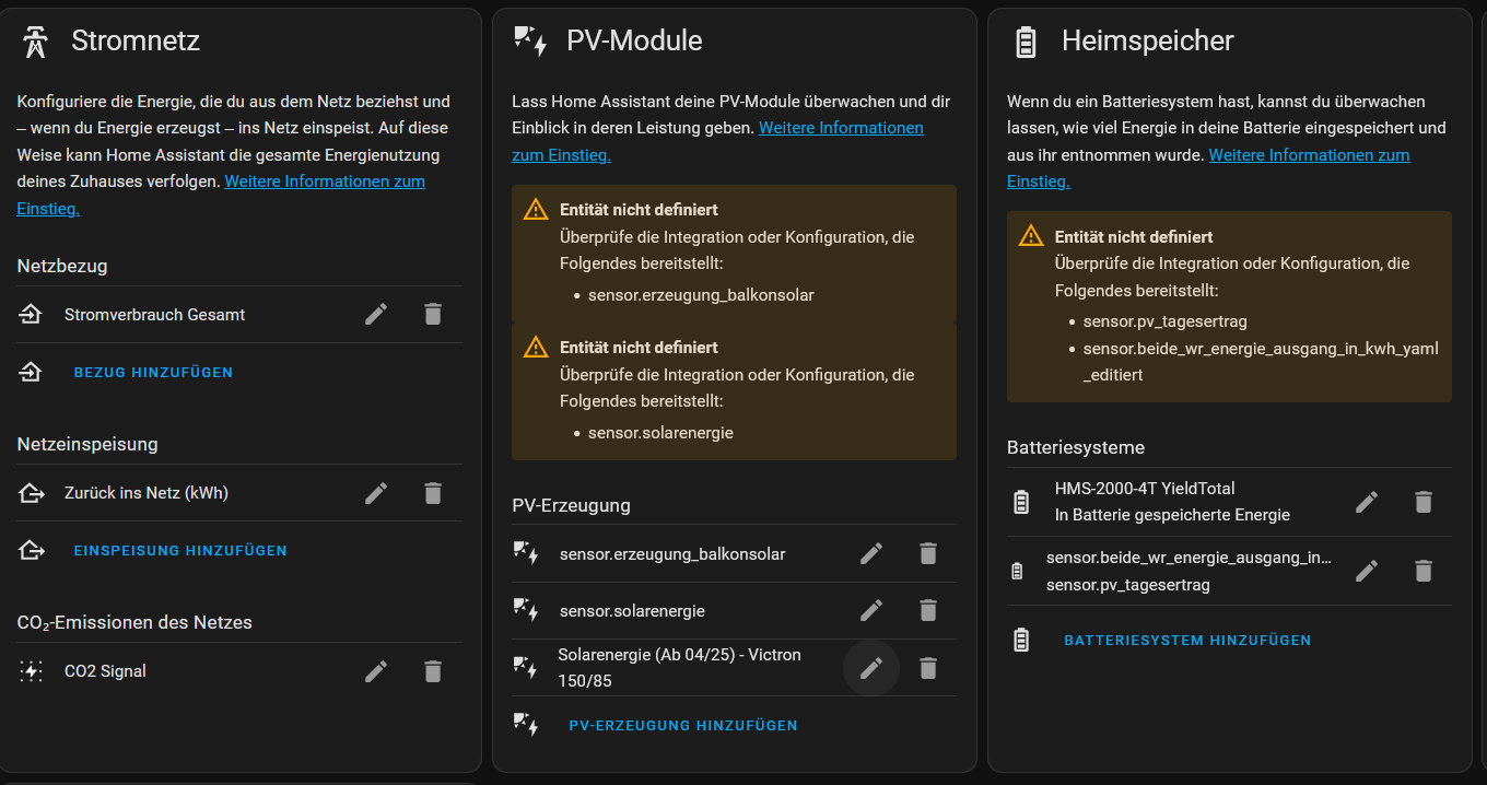 In der PV Erzeugung ist lediglich der Sensor "Solarenergie (Ab04/25) - Victron 150/85 aktiv - die anderen beiden Erzeugungssensoren sind veraltet und nicht mehr aktiv (Daher auch die Fehlermeldungen im Dashboard)