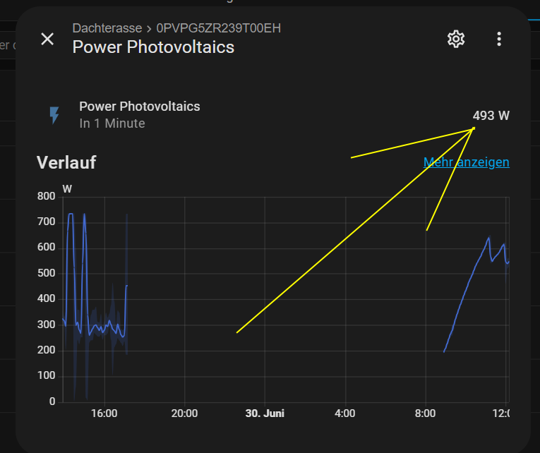 Bild oben ist die momentane Erzeugung und unten das E-Dashboard. Im E-Dashboard werden keine Momentanwerte angezeigt. Bitte schildere noch einmal genauer, was du erwartest und was evtl. nicht geht.
