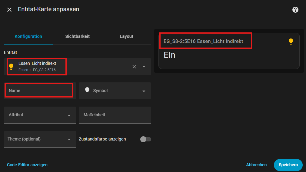 Meine Gerätenamen wurden aus der Homematic übernommen. Wenn ich in dem Entitäten Auswahlfeld nach Essen Licht suche, dann zeigt es mit beispielsweise mein Essen_Licht indirekt an. Wenn ich keinen separaten Namen in der Karte vergebe, wird mir im Dashboard aber davor noch der Name des Schaltaktors angezeigt (EG_S8-2:5E16 Essen_Licht indirekt)