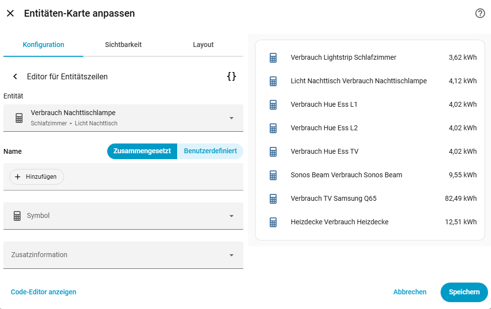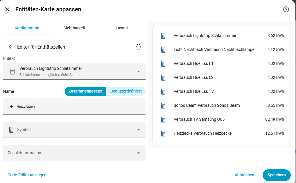 Ich weiss nicht so recht. Nehmen wir mal dieses Beispiel: Hier ist der Verbrauch Lightstrip Schlafzimmer korrekt dargestellt. Den Entitätennamen habe ich mal eingegeben. Unter “Name” steht nichts. Bei der Nachtischlampe hingegen, wird dem Entitätennamen “Verbrauch Nachttischlampe”, den ich genauso mal vergeben habe, noch “Licht Nachttisch” vorangesetzt, obwohl die Entitätenkarte genauso aussieht, wie bei Lightstrip Schlafzimmer.