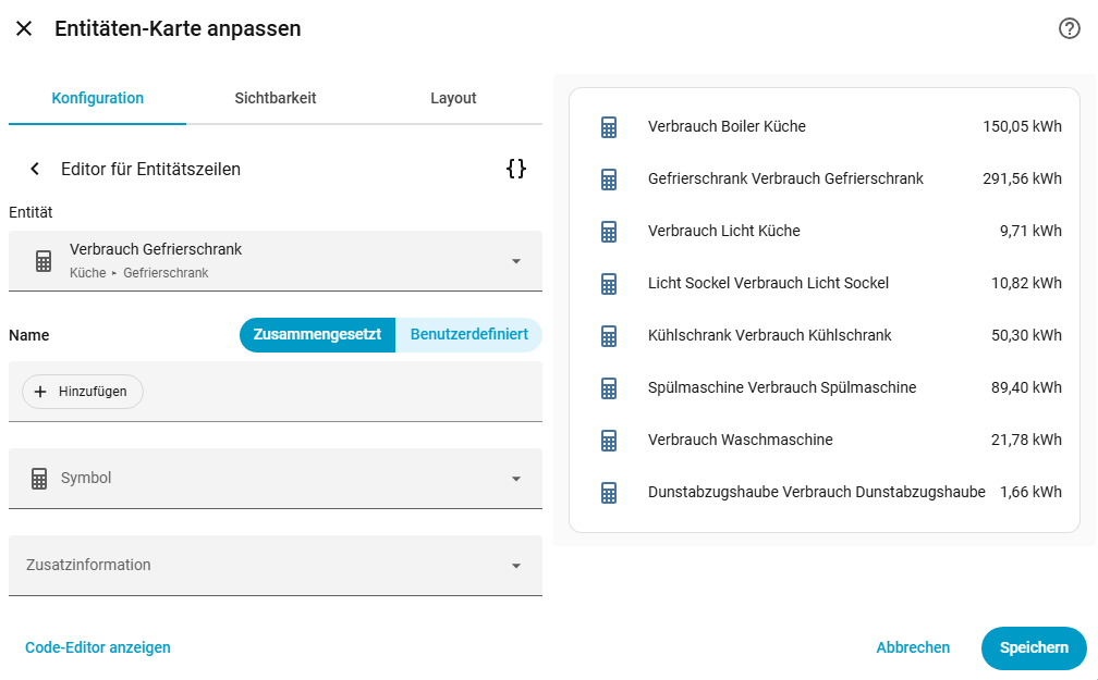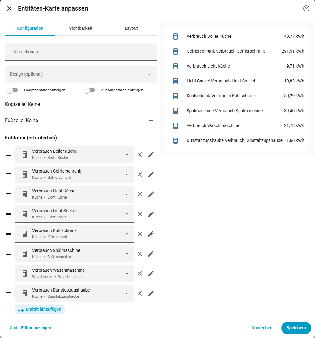 ich habe gerade festgestellt, dass meine Entitäten-Karten, welche Verbräuche darstellen, plötzlich die Namen seltsam darstellen. Im Bild sieht man die Entitätenkarte und links die korrekten Namen, rechts das, was die Karte daraus macht. Bei einigen Entitäten wird vor dem “Verbrauch” nochmal das gerät wiederholt.