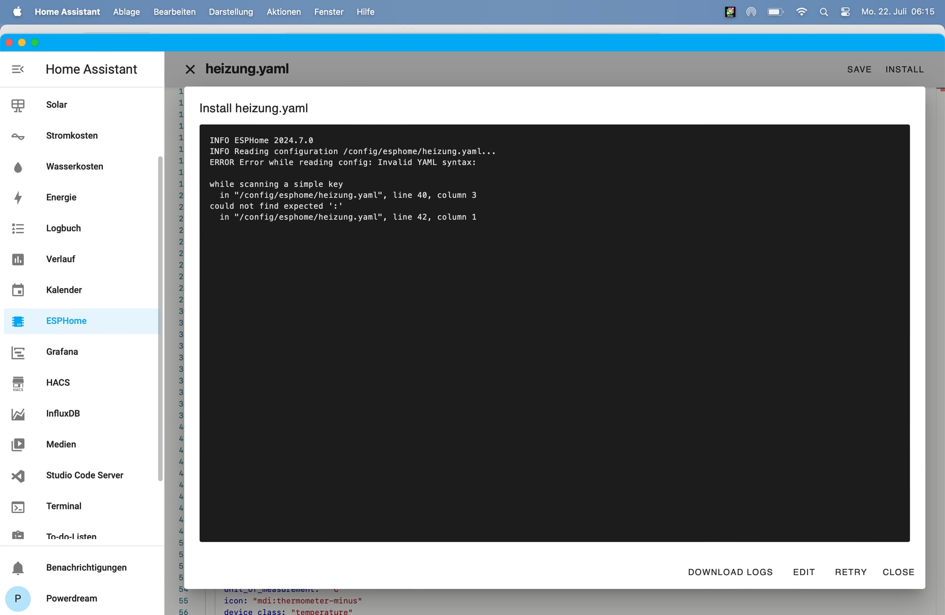 Seit dem letzten Update Home Assistant habe ich Probleme mein ESP Home für die Heizung zu updaten. Ich habe schon so viel probiert. Anbei die Fotos der Fehlermeldung und des Codes Zeile 40 und 42 . Bin für Tips dankbar