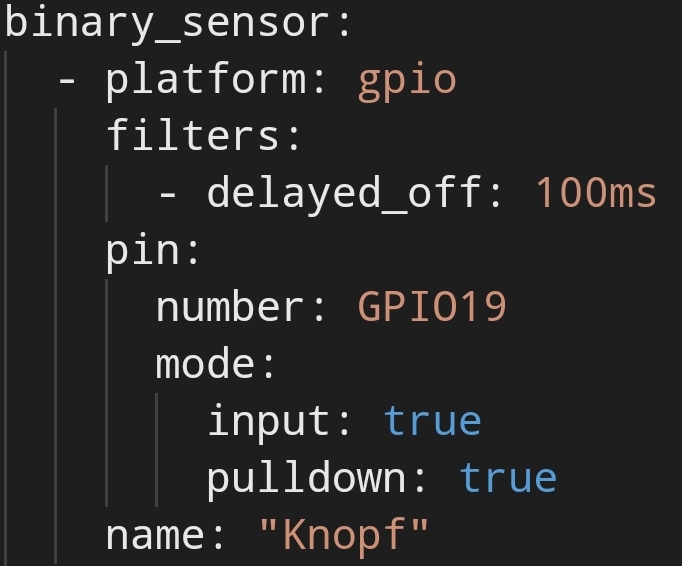 ich hab einen ganz klassischen Taster an einem MOdeMCU bord zwischen der 3 Volt pin und einen GPIO Pin gehängt. In der ESPHome-config sieht das so aus: