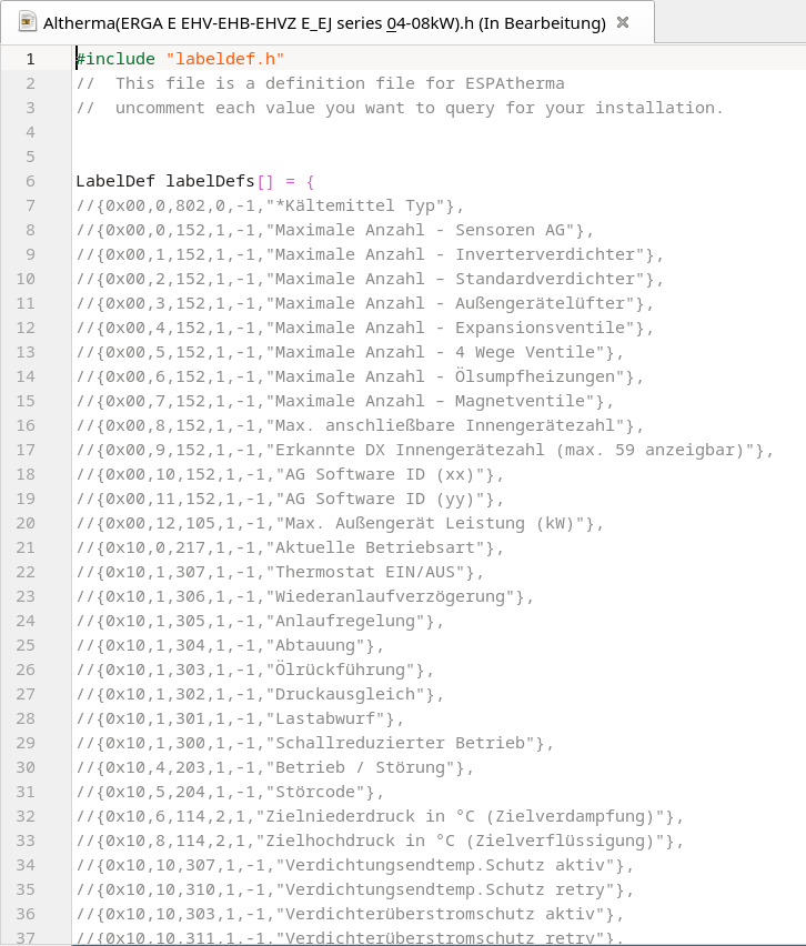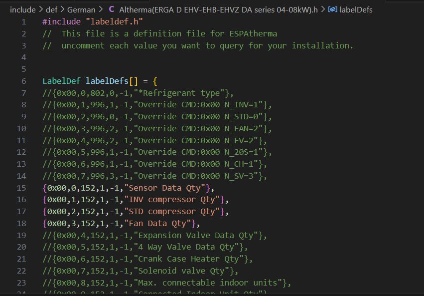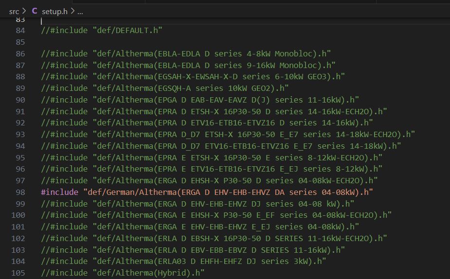 Dann musst Du noch die richtige WP raussuchen und die benötigten Sensoren auskommentieren, bei mir ist es diese Datei hier “Altherma(EPRA D_D7 ETSH-X 16P30-50 E_E7 series 14-18kW-ECH2O).h” sonst steht die Auswahl auf DEFAULT !