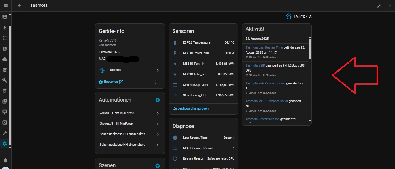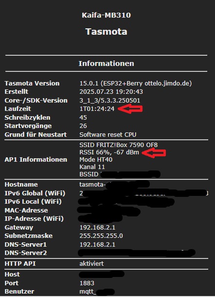 Also wenn ich sehe wie oft du falsche Werte bekommst, hast du wohl ein größeres Problem. Du musst in der Tasmota Oberfläche auf Information klicken. Dort siehst du wann Tasmota das letzte mal neu gestartet wurde. Was auch Interessant wäre ist die Verbindungsqualität im WLan.
