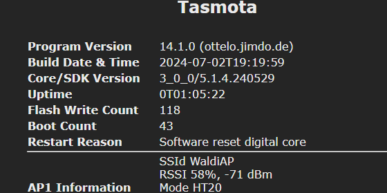 Eventuell noch die Stromversorgung. Ein gutes Netzteil, im Notfall auch Ladegerät wäre noch wichtig. Sollte schon gut 2A abgeben können. Wenn diese Teile ein paar Jahre auf dem Buckel haben, bauen die ab. Es kann sein das das Netzteil / Ladegerät beim Senden der Daten so stark einbricht, das Tasmota neu startet. Versuch mal ein Anderes.