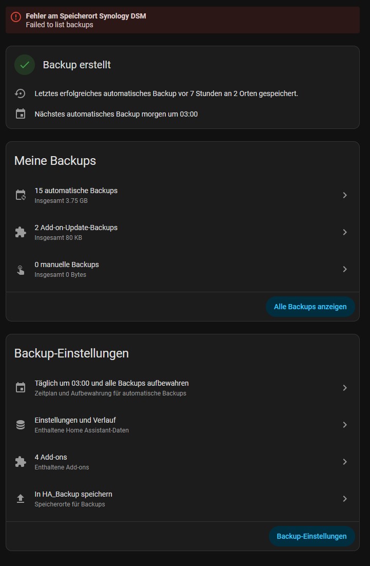 den “Fehler am Speicherort Synology DSM Failed to list backups” habe ich auch seit Januar 2025. Bei mir ist es entstanden, weil ich die erstellten Backups direkt auf der Synology gelöscht habe an stad über Home Assistant. Die Backups laufen ohne Probleme habe aber die Fehlermeldung.