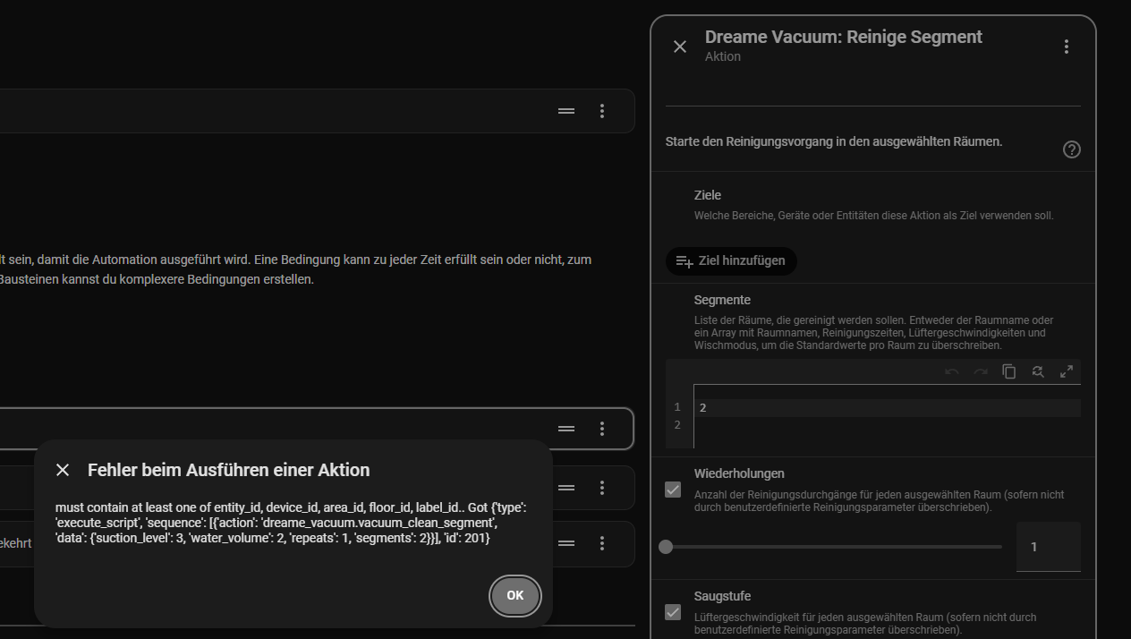 Jetzt habe ich das Problem, das er mir bei dem Schritt “Dreame Vacuum: Reinige Segment” diesen Fehler wirft: