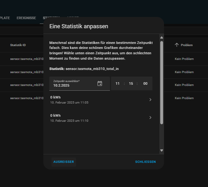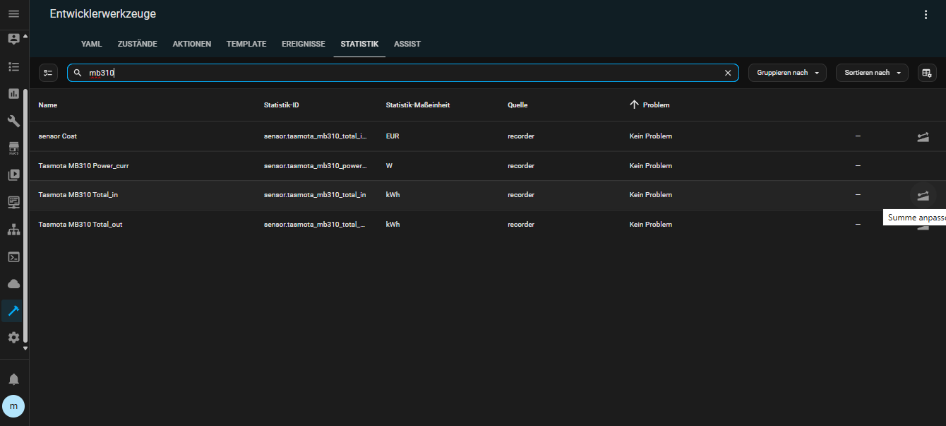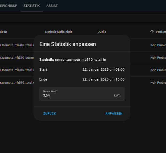 Das Problem danach war aber dann, dass es mir die Statistik im Energie Dashboard zerlegt hat und dort ein Verbrauch von ca 7800 kWh für eine Stunde angezeigt wurde.
