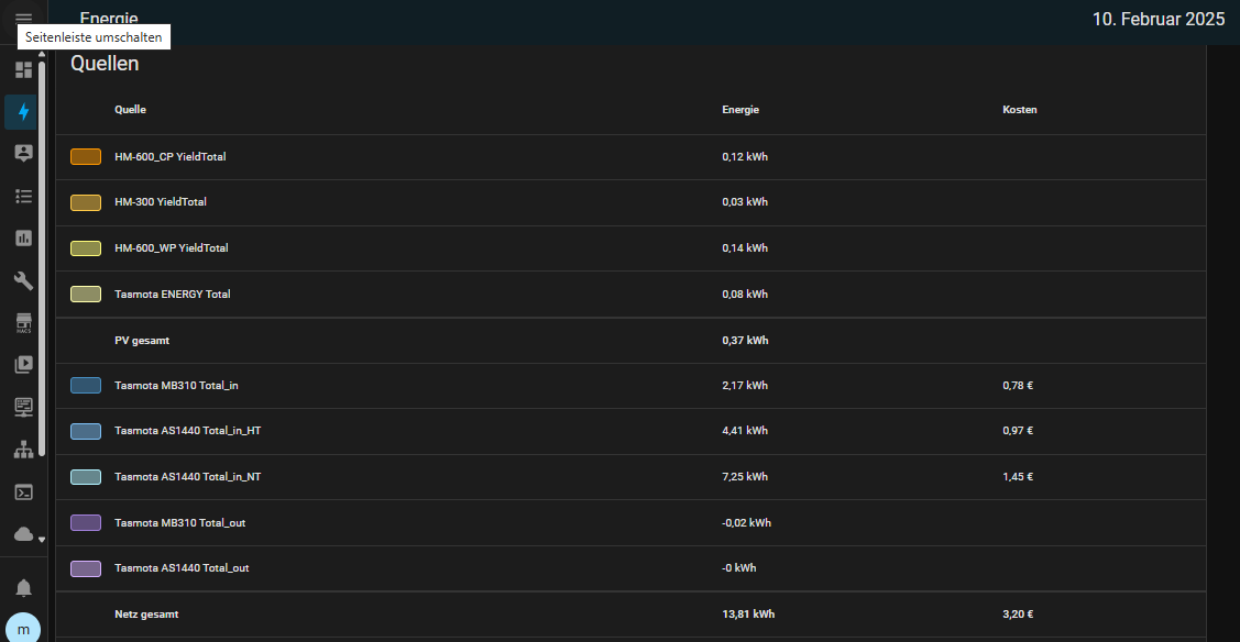 Die Werte dieses neuen Sensors “power_total” habe ich im Energier Dashboard eingebunden. Das funktioniert auch seit jeher sehr gut. Gestern war es dann plötzlich einmal der Fall,