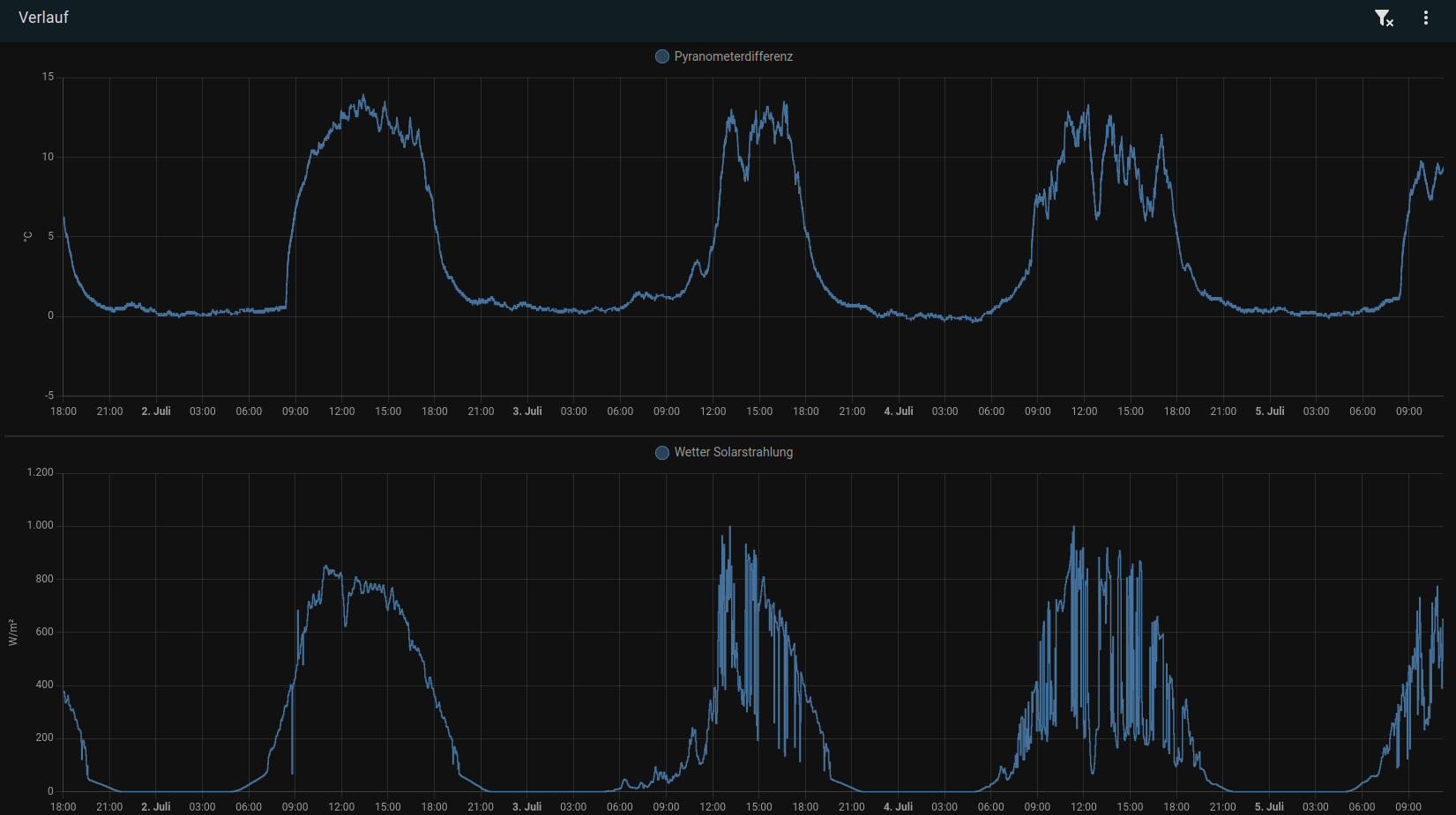Vorab: Wenn man selbst einen Sensor auf dem Dach o.ä. hat der einem die Solarstrahlung (w/m², wie z.b. von Suedschwede vorgeschlagen) liefert, dann ist das, was ich hier mache, nicht nötig. Hab ich nur leider nicht