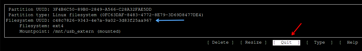 Und wenn man cfdisk /dev/sda noch mal aufruft, dann sieht man unten auch bei Filesystem die UUID