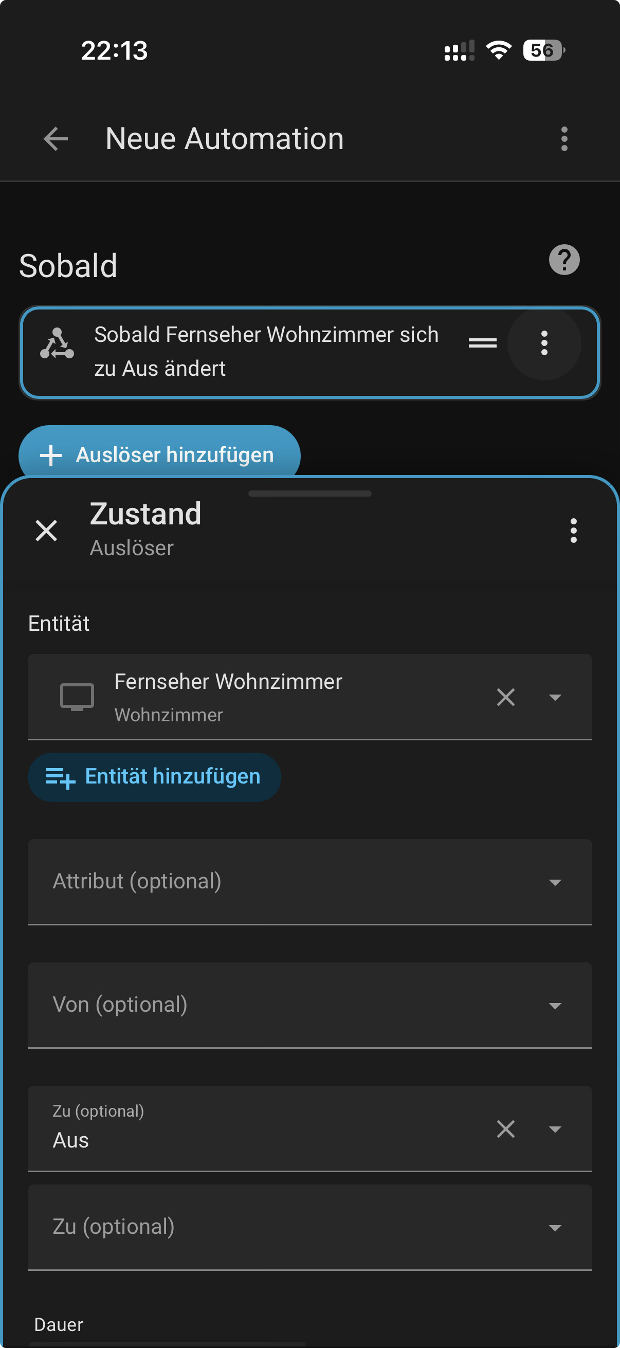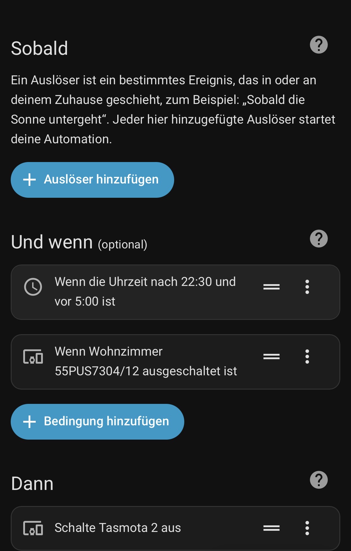 Das führt dann dazu, dass die Automation um 22:30 Uhr ausgelöst wird. Läuft der Fernseher, passiert nix. Dann wird sie wieder ausgelöst, wenn der Fernseher ausgeschaltet wird, dann sind beide Bedingungen erfüllt und die Aktion wird ausgelöst.