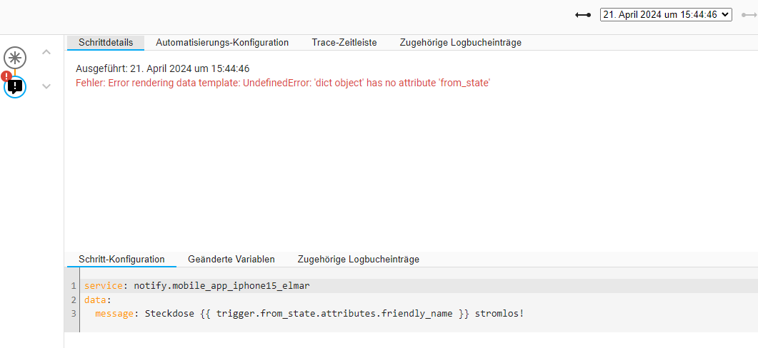 Nunja, aber wenn ich keine Variablen oder ähnliches in der message übergebe, funktioniert die Automation schon. Auch die Schrittdetails (trace) werden richtig angezeigt. Auch bei komplexeren Abläufen.