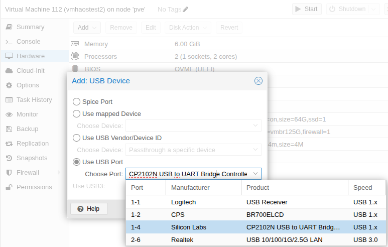 Anm.: Ich habe dafür schon immer Use USB Port genutzt, aber eine Einbindung perUse USB Vendor/Device IDfunktioniert ebenfalls und was dann von beiden der ggf. bessere oder sinnvollere Weg ist soll hier nicht Thema sein. - Damit ist das Thema anschließen des USB-Dongle an den Proxmox Host und durchreichen an die HA VM erledigt.