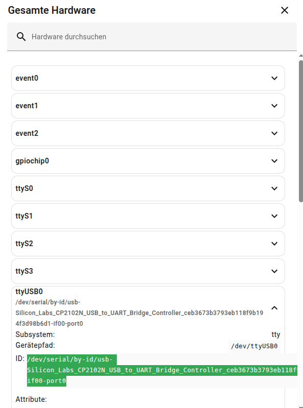 - Bei HA über Einstellungen —> System —> Hardware —> Gesamte Hardware nachschauen ob dort der USB-Dongle auftaucht. Das sollte dann z.B. so aussehen: