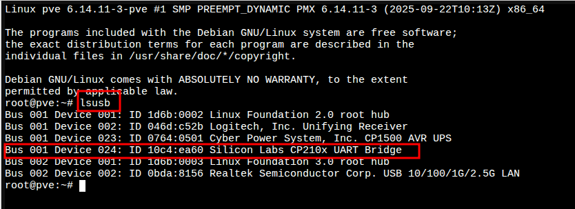 lsusbnachschauen ob der Dongle von dem Proxmox Host auch erkannt wird.