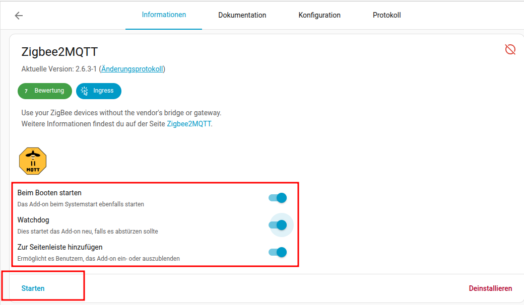 - Bei den HA Addons das Z2M Addon aufrufen und es per Installieren-Button installieren.