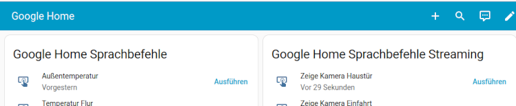 Ab und an lasse ich mir dann auch mal mein HA Standard-Dashboard auf den Displays anzeigen und ich habe mir noch ein extra Dashboard erstellt. Auf diesen werden dann aber lediglich die Sprachbefehle für die HA Scripte angezeigt/aufgelistet, die ich bei Google Home für das auslösen von irgendwelchen Dingen hinterlegt habe.