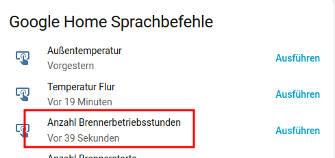 Bsp.: Ich will wissen wie viele Betriebsstunden der Brenner in meiner Wolf Heizung bereits auf dem Buckel hat und mir fällt der bei Google Home dafür hinterlegt Sprachbefehl nicht mehr ein. Jetzt könnte ich mich natürlich durch die Google Home App klicken und dort nachschauen, oder ich rufe einfach das extra Dashboard auf dem Display auf und schaue dort in der Übersicht nach wie der Befehl lauten muss. In dem Fall wäre die korrekte Spracheingabe: Anzahl Brennerbetriebsstunden