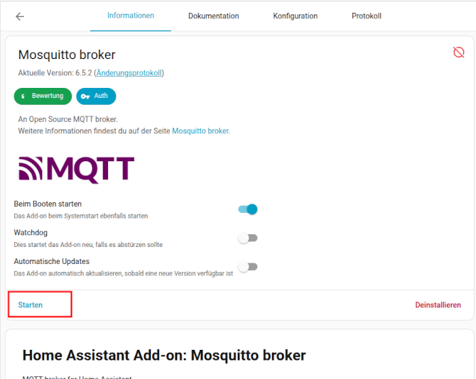 Nachdem die Installation erfolgt ist weicht die Installation von früheren Anleitungen und auch von der offiziellen Mosquitto broker Doku ab. Es müssen bei der Mosquitto broker Konfiguration keinerlei Einstellungen vorgenommen werden. D.h. es muss dort kein User eingerichtet werden. Auch muss - wieder im Gegensatz zu früher - unter HA auch kein extra User für den MQTT Broker angelegt werden. All das macht HA jetzt automatisch. Daher folgt als nächster Schritt den MQTT Broker direkt zu starten