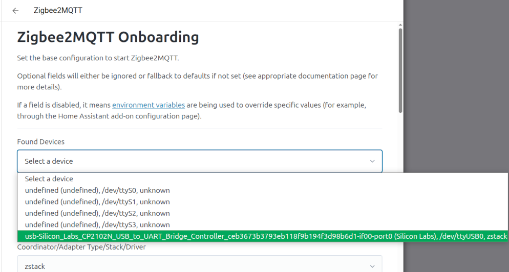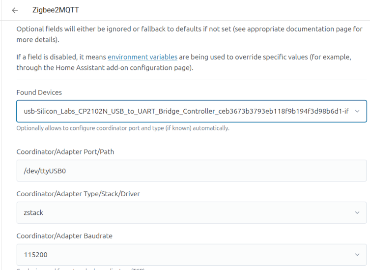 Je nach verwendeten Dongle und wie dieser mit dem HA Host verbunden ist, können dort natürlich ganz unterschiedliche Einträge notwendig sein, auf die ich hier aber nicht weiter eingehe. Wenn der Dongle von Z2M offiziell unterstützt wird findet man die für ihn notwendigen Einstellungen bei den Z2M Infos zu den Adapter-Einstellungen: