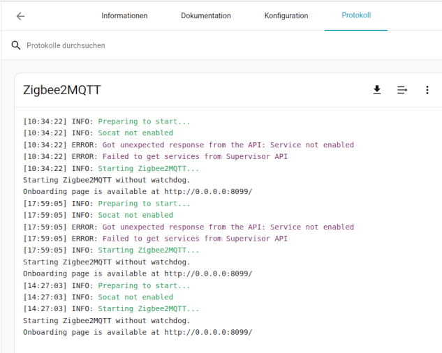 Wenn das Z2M Addon unter HA installiert und erstmalig gestartet wurde, sollten die Einträge in dem Z2M Protokoll so in der Art aussehen und Z2M “wartet” darauf über den Z2M Onboarding-Prozess erstmalig eingerichtet zu werden. Da dies bisher noch nicht passiert ist erscheint auch die Fehlermeldung zu der Supervisor API.