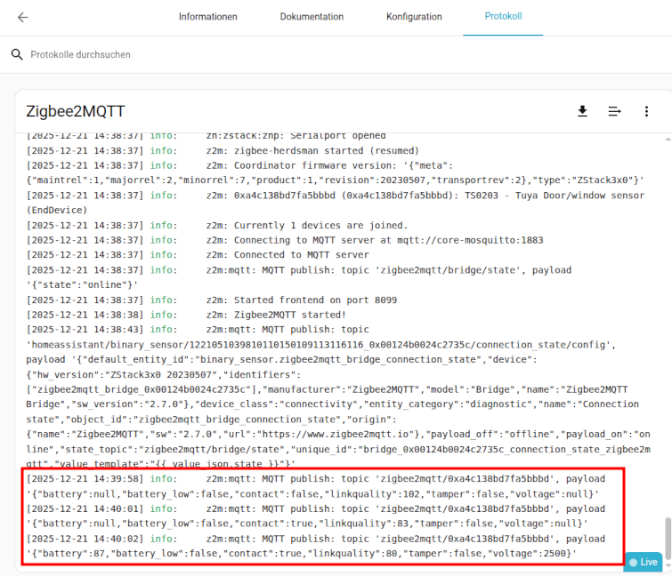Wenn man ein Gerät unter Z2M angelernt hat kann man bei der HA MQTT Integration auch prüfen ob dieses dort auch vorhanden ist - wie hier jetzt der Tuya Tür-/Fenstersensor