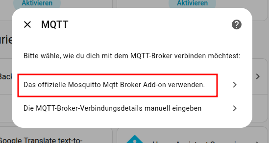 Anschließend wird man gefragt ob man das offizielle Mosquitto MQTT Broker Add-on verwenden will, oder eben selber irgendeinen (externen) MQTT Broker einrichten möchte. Da wir ja das HA Mosquitto broker Addon verwendet wählt man also den ersten Punkt aus.