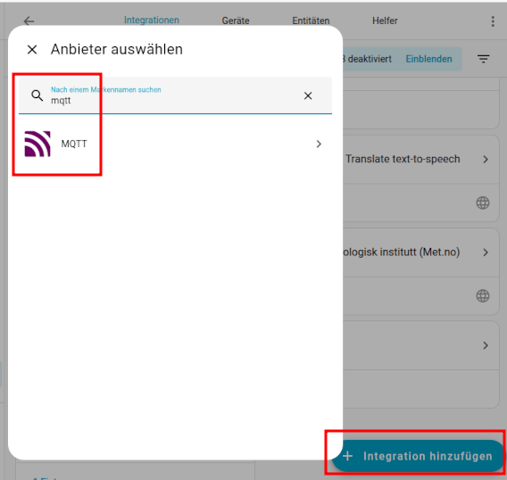 Die MQTT Integration unter HA installieren. Dazu geht man bei HA zu Einstellungen —> Geräte & Integrationen und klickt dann unten rechts auf Integrationen hinzufügen.