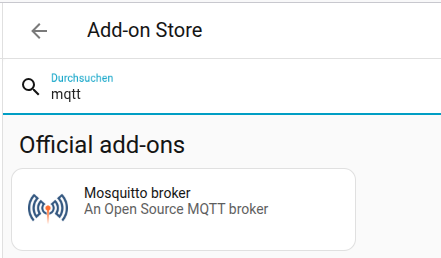 Unter HA das Mosquitto broker Addon installieren. Den HA Add-on Store aufrufen und nach MQTT suchen.
