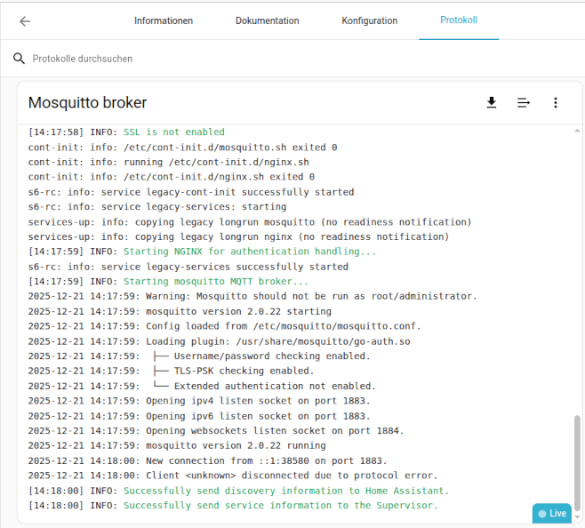 Wenn man das gemacht hat und das Mosquitto broker Addon läuft, kann man mal einen Blick in das Mosquitto broker Protokoll werfen. Das sollte dann so aussehen und man sieht das das Mosquitto broker Addon und somit auch der MQTT Server, läuft.