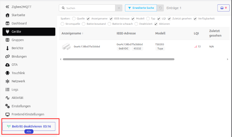 Dann kann man über den Button Beitritt erlauben anfangen seine Zigbee Geräte unter Z2M anzulernen. Was hier in dem Beispiel gerade für einen Tuya Tür-/Fenstersensor erfolgt ist.