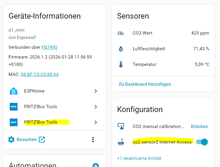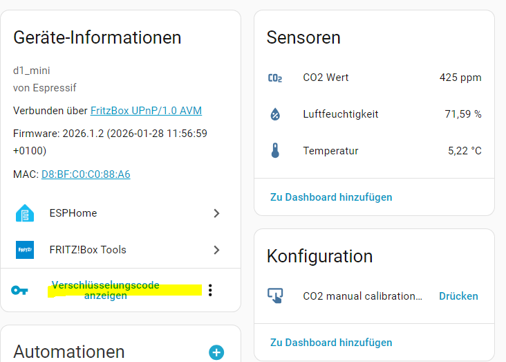 Und wie soll das dann gehen und was hat Dein Testsystem damit zu tun? Wie willst Du denn einen mit einer ESPHome Firmware geflashten ESP - vermutlich ja Deinen ESP32 mit dem SCD41 - unter HA nutzen, ohne das Du da dann auch ESPHome nutzt? Wer oder was soll denn die Werte, die der ESP32 per ESPHome liefert, dort empfangen und dann auch darstellen?