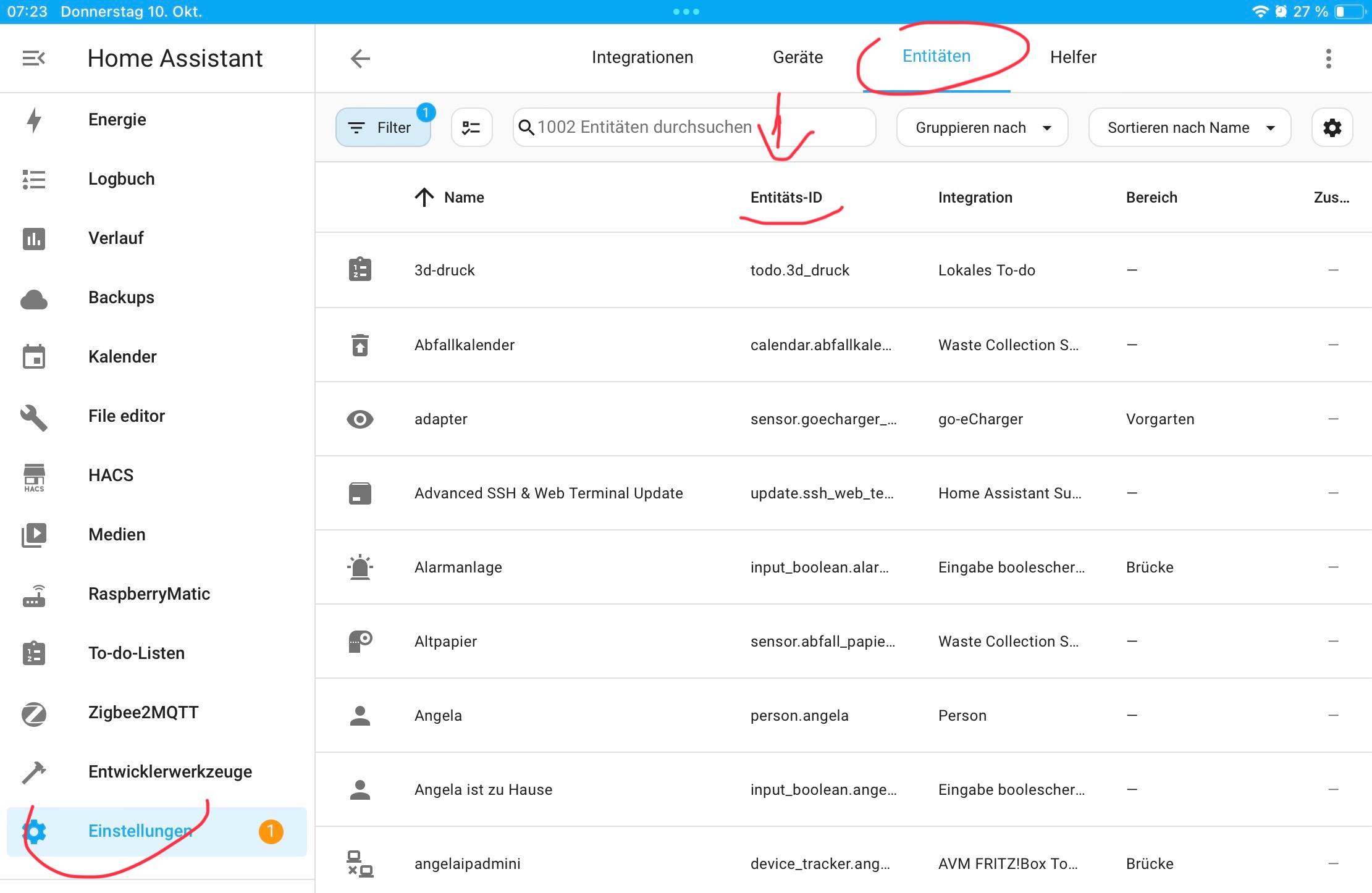 Im linken Menübaum gehst du über Einstellungen. Dann auf Geräte & Dienste, dann oben auf Entitäten klicken (ist ein Weg, wenn du weißt was du suchst). Statt auf Entitäten, kannst du auch auf der Integrationsseite die gewünschte Integration suchen, die anklicken, dann dort auf Entitäten klicken. Dann ist es direkt danach gefiltert. Aber ich gebe meinem Vorredner etwas recht, das Grundlagen Video solltest du trotzdem einmal schauen.