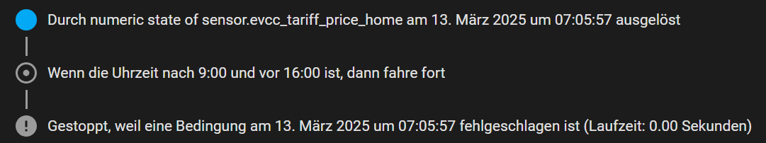 Ich nutze meine Klimas als Heizungsunterstützung der Gastherme. Sie sollen zwischen 9 Uhr und 16 Uhr laufen, wenn der Dynamische Strompreis unter 30 cent fällt. Ich hänge meine yaml mit an. Das Problem ist: der Preis Trigger löst manchmal schon um 7 oder so aus, und der zeit Trigger ist dann halt noch nicht so weit. Die Automatisierung wartet aber nicht, und ist somit fehlgeschlagen. Ein erneutes Auslösen findet eigentlich nur statt, wenn der Preis dann wieder über 30 cent geht, was allerdings meist erst nach etlichen stunden der fall ist.
