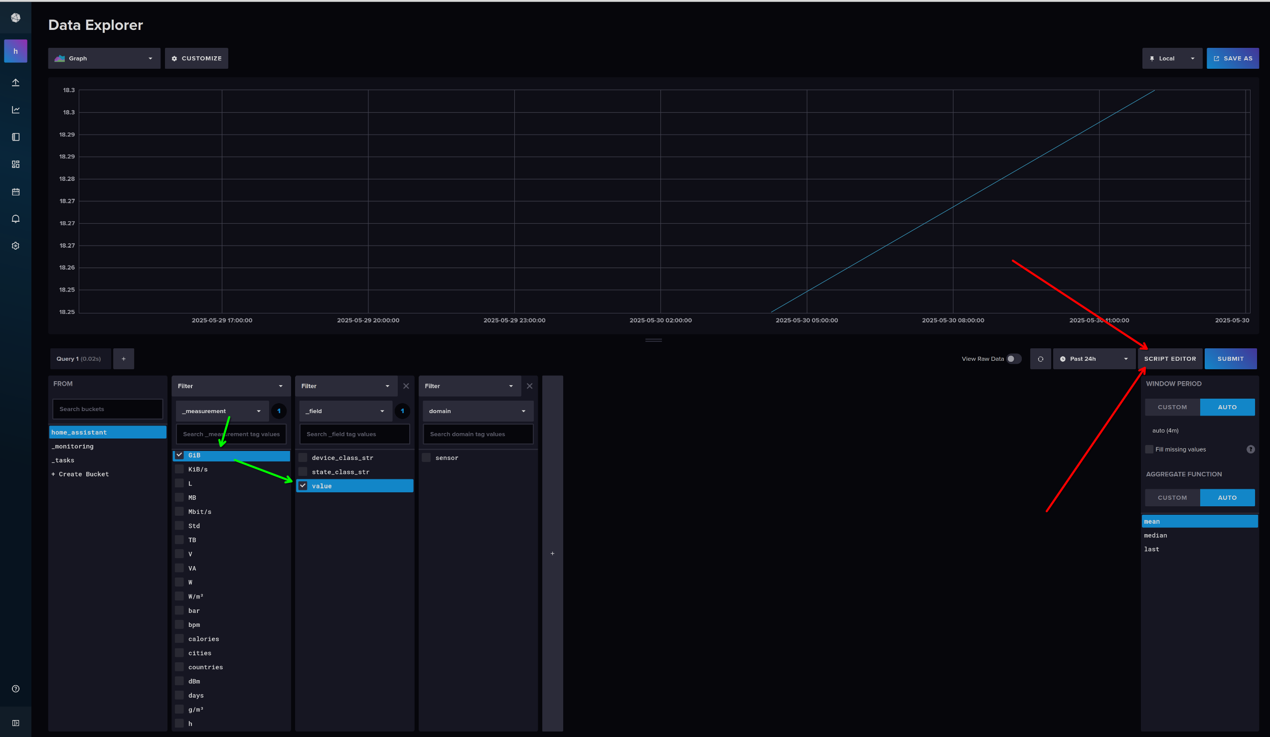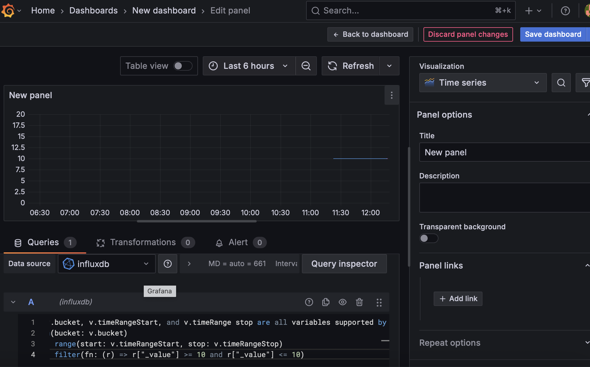 Wenn Du aber und das vermute ich mal, influxDB in Version > 1.8 installiert hast, da ist, wenn Du das nicht expliziert angibst, dann FLUX als Abfragesprache, die ist aber nicht in Grafana als zusammen klickbar implementiert, hier musst Du einen anderen Weg einschlagen.