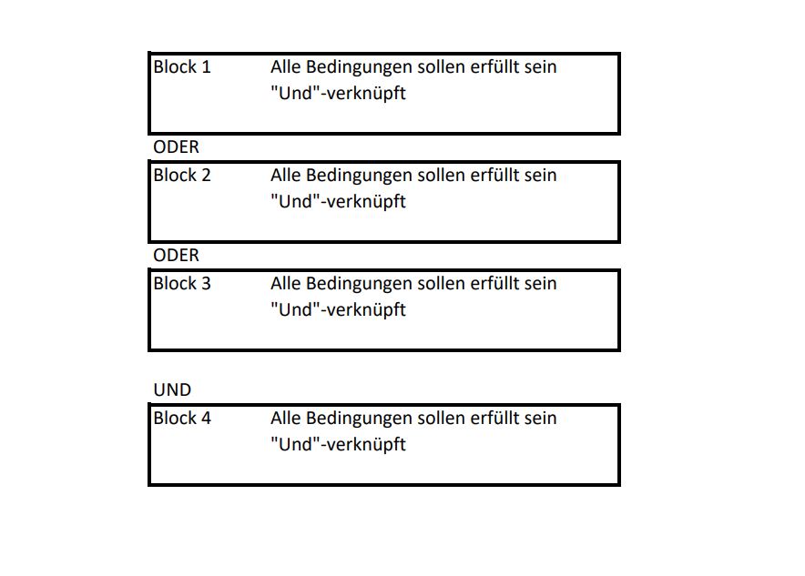 Wenn Du eine große „OR“-Bedingung machst in den Bedingungen und darin dann 2-n „AND-Bedingungen mit deinen eigentlichen Bedingungen darin müsste es auch gehen.