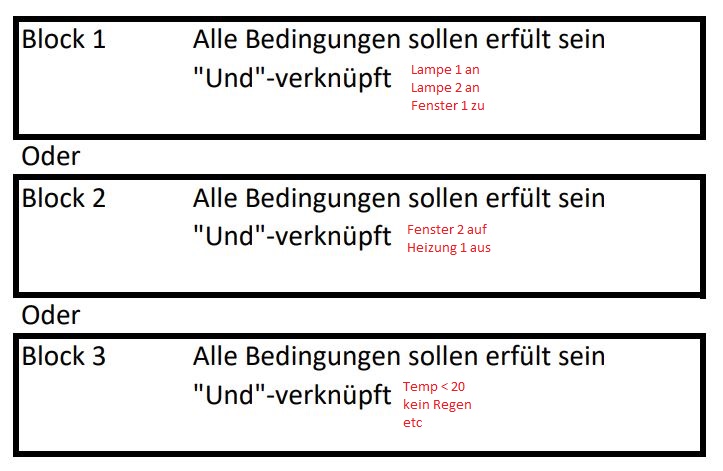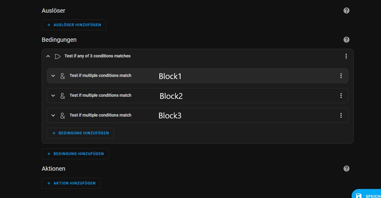 trotz zahlreicher Tutorials habe ich nach wie vor Probleme bei dem Erstellen von Automatisierungen. Genauer gesagt, mit den Bedingungen. Ich finde einfach meinen „roten Faden“ nicht so richtig… Bei meinem alten System ist das eher so in „Blöcke“ aufgeteilt: „wenn“ – „dann“ wie bei RaspberryMatic.